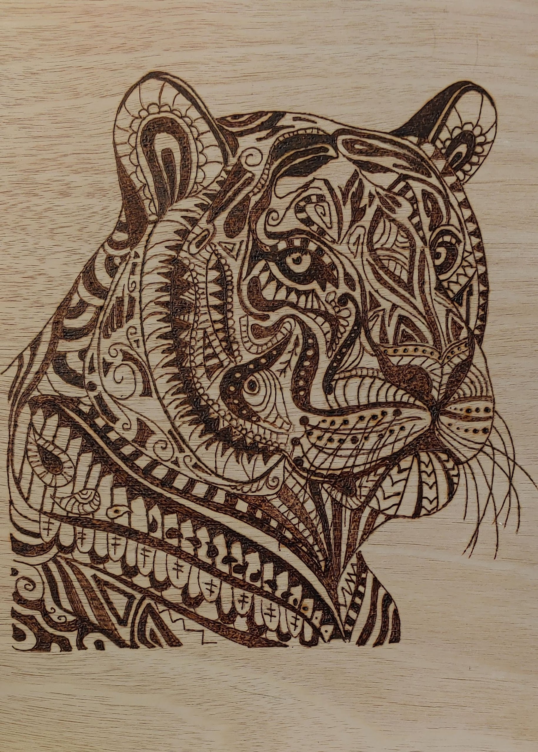Stylized lion? Maybe a leopard? Done in mandala style. Burned on white birch, 9"x12".