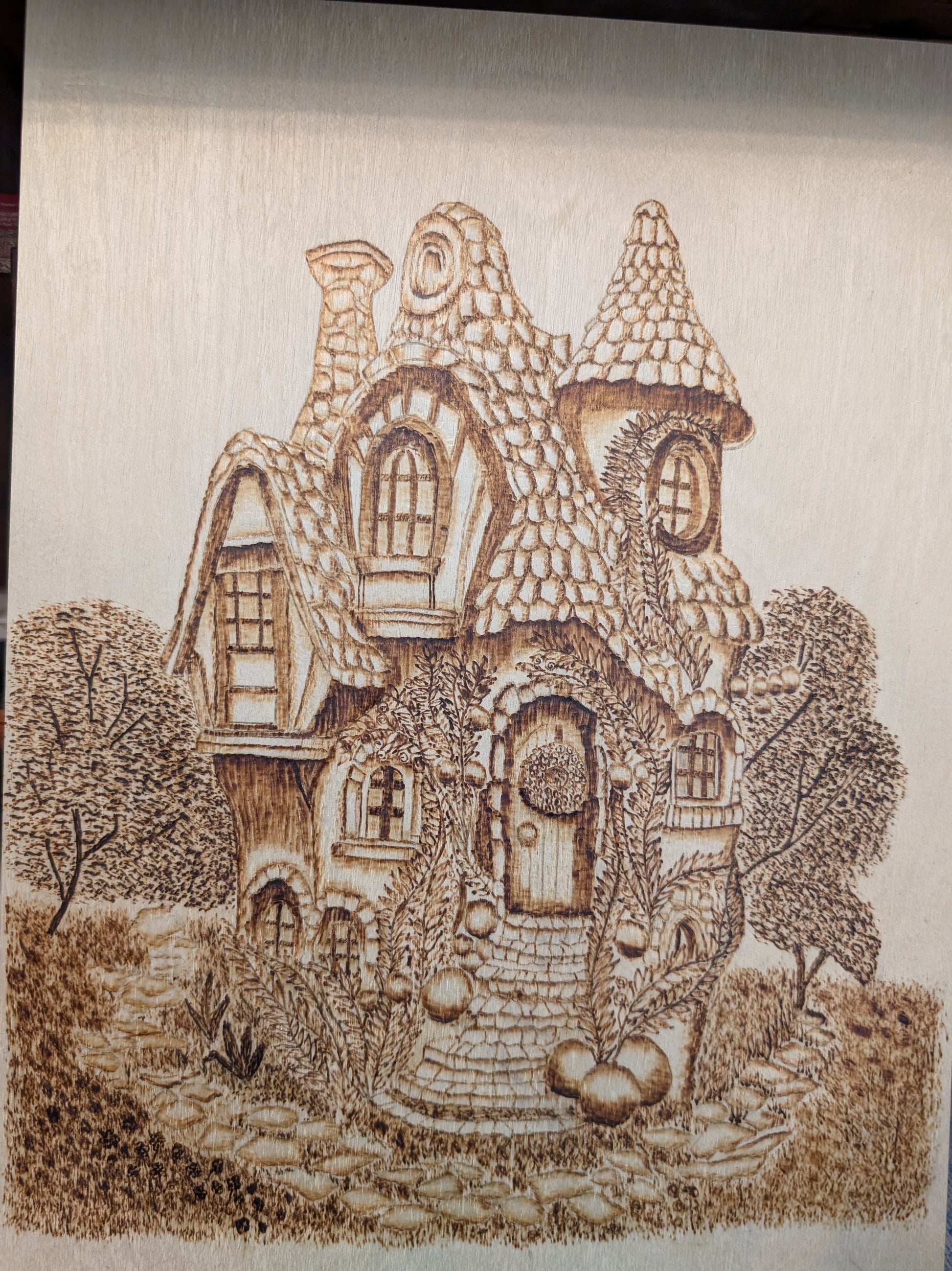 Fantasy cottage fit for a fairy! Burned on white birch, 9"x12".