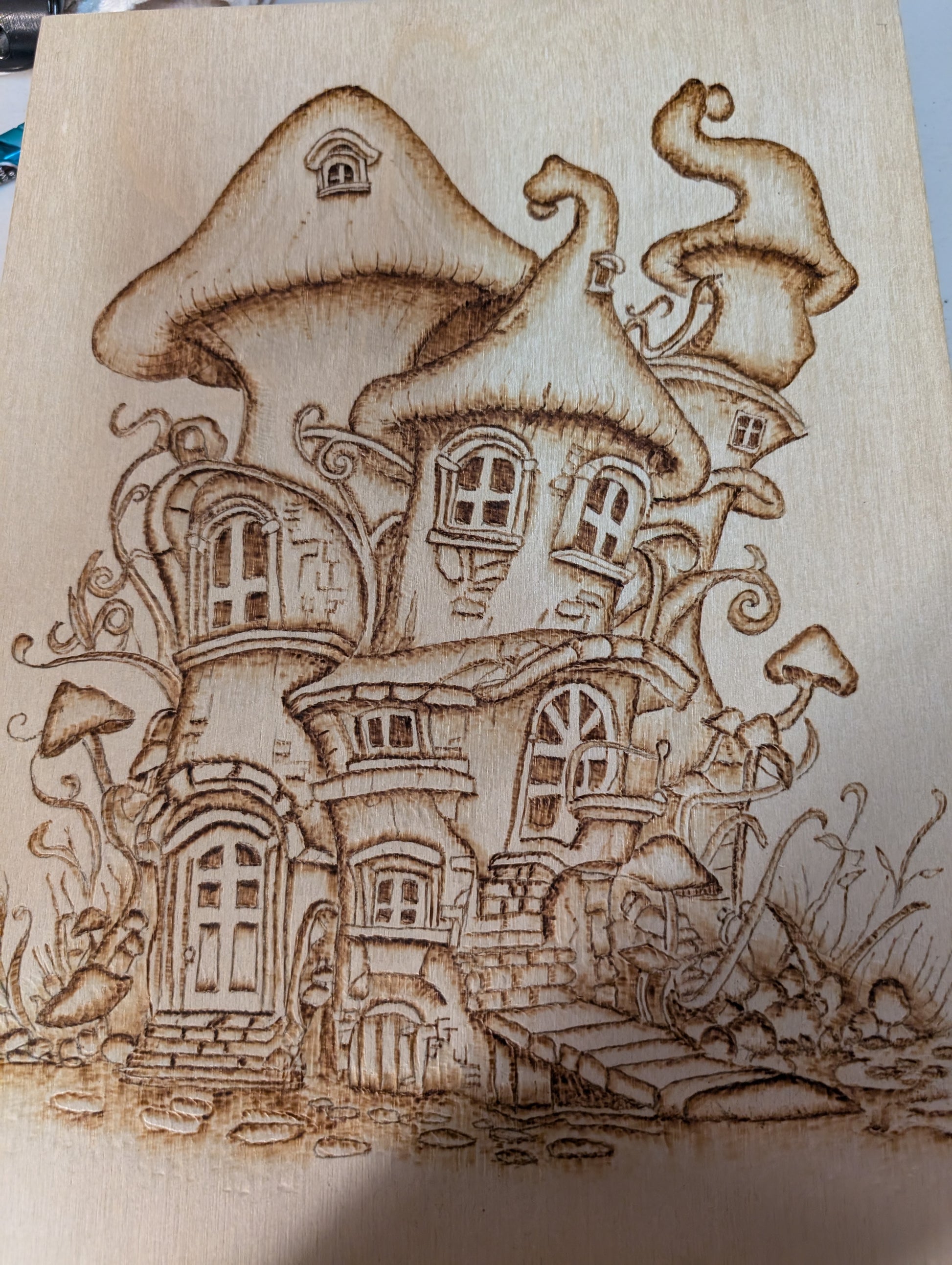 Fantasy mushroom house, fit for a fairy! Burned on white birch, approximately 9"x12".