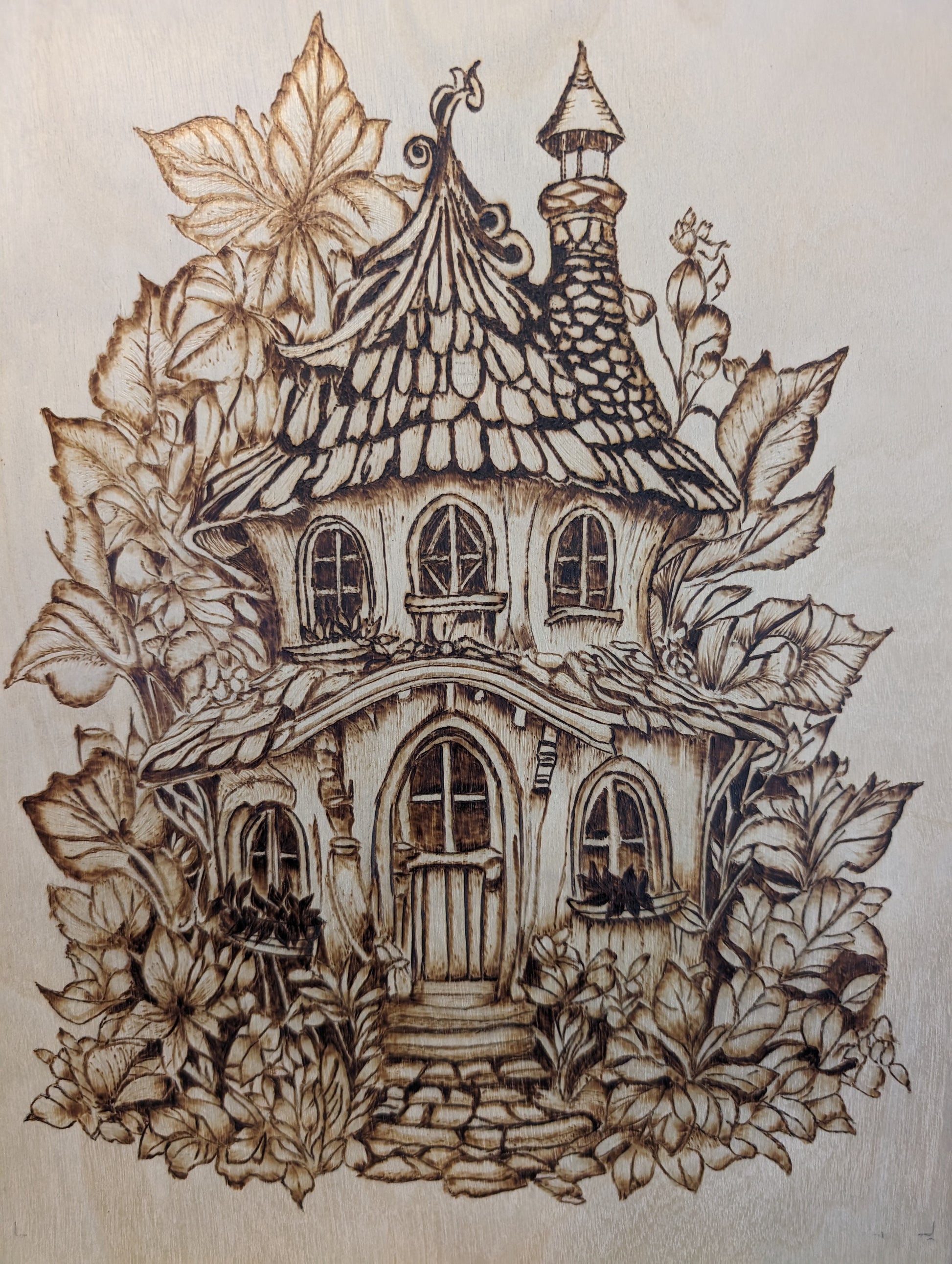 Fantasy house, fit for a fairy! Burned on live-edge birch, approximately 9"x12".