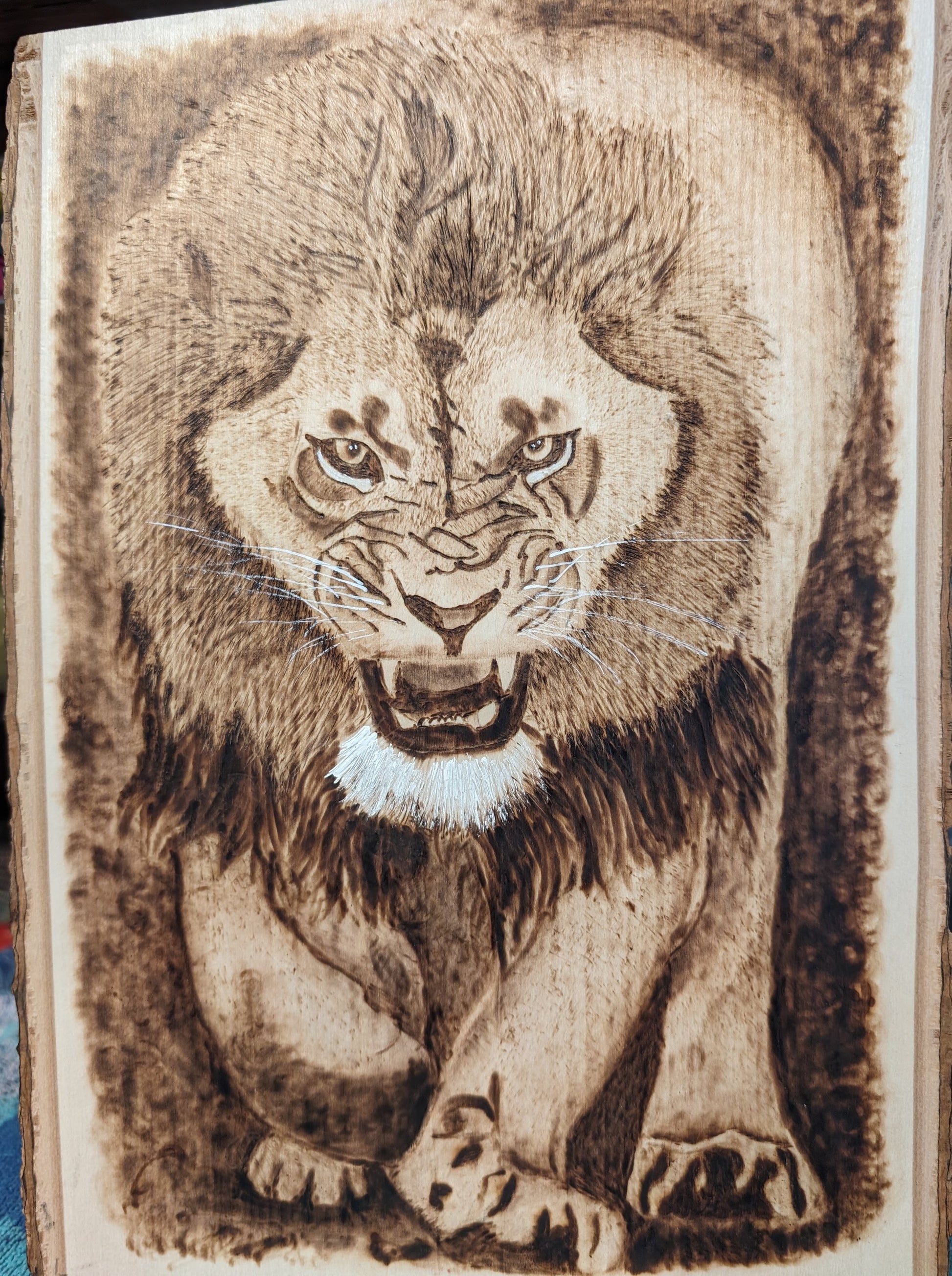 Fierce lion ready for the hunt! Burned on live-edge birch, approximately 9"x12".