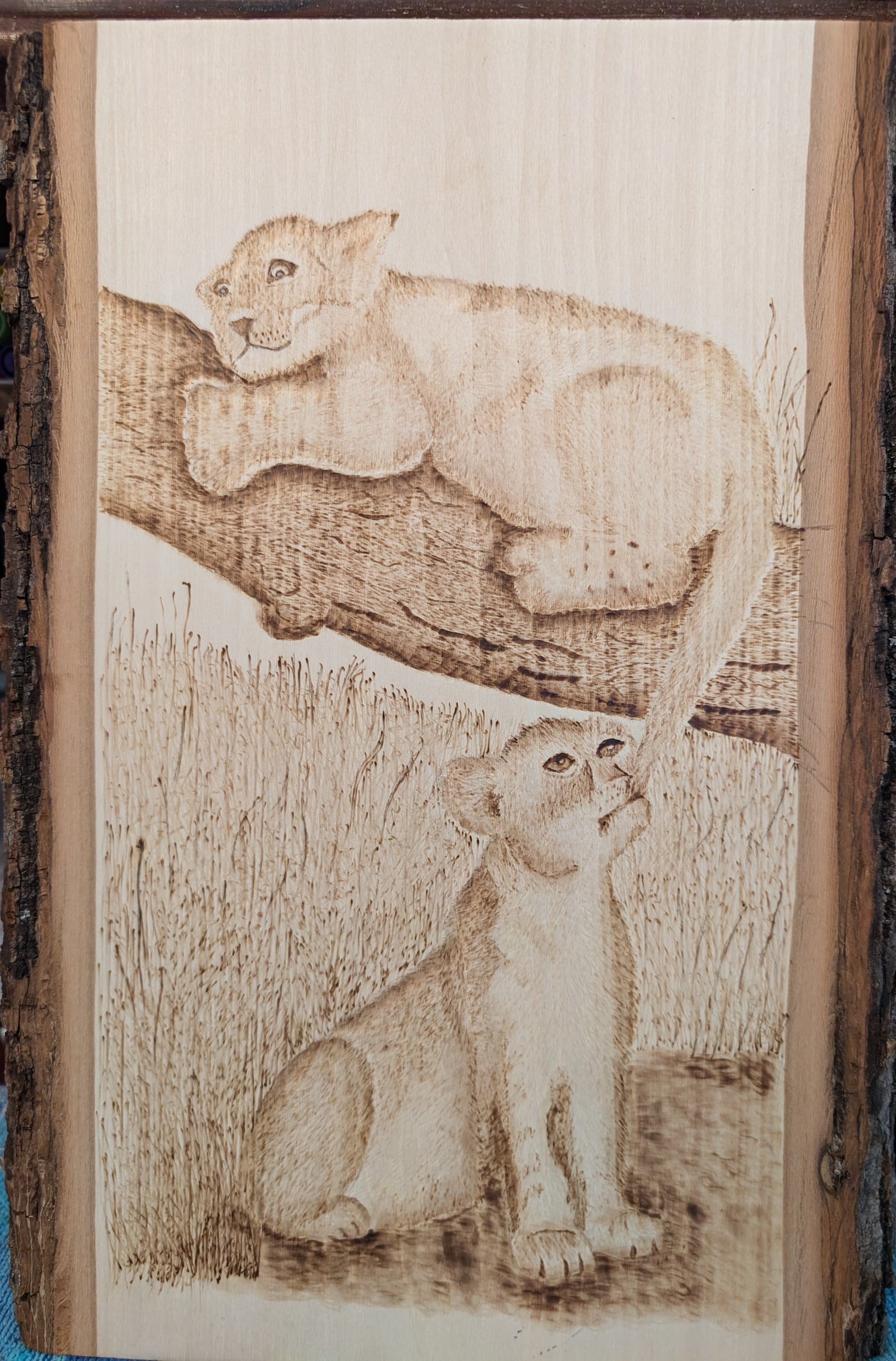 These playful lion cubs are ready to wrestle! Burned on live-edge birch, approximately 9"x12".