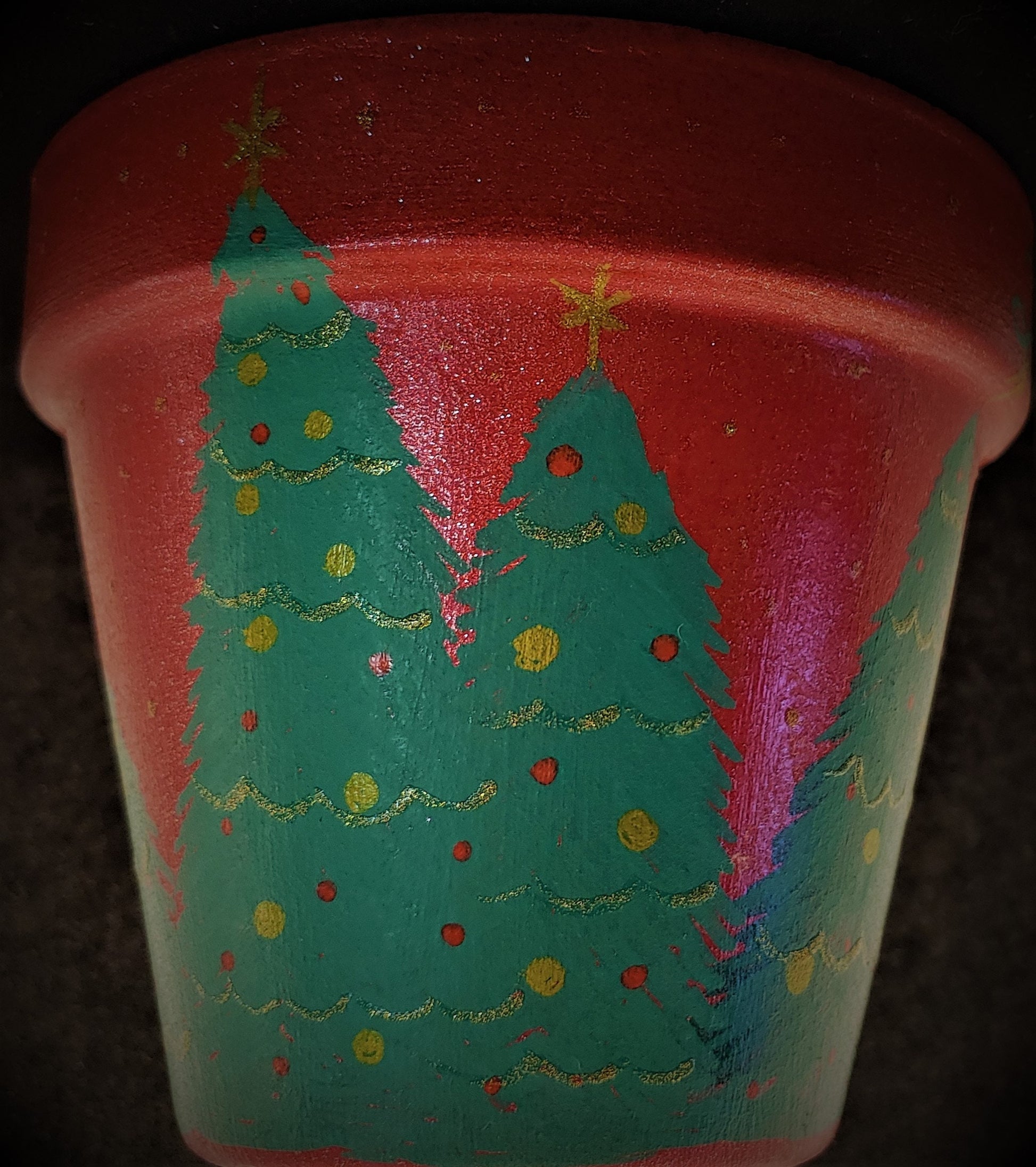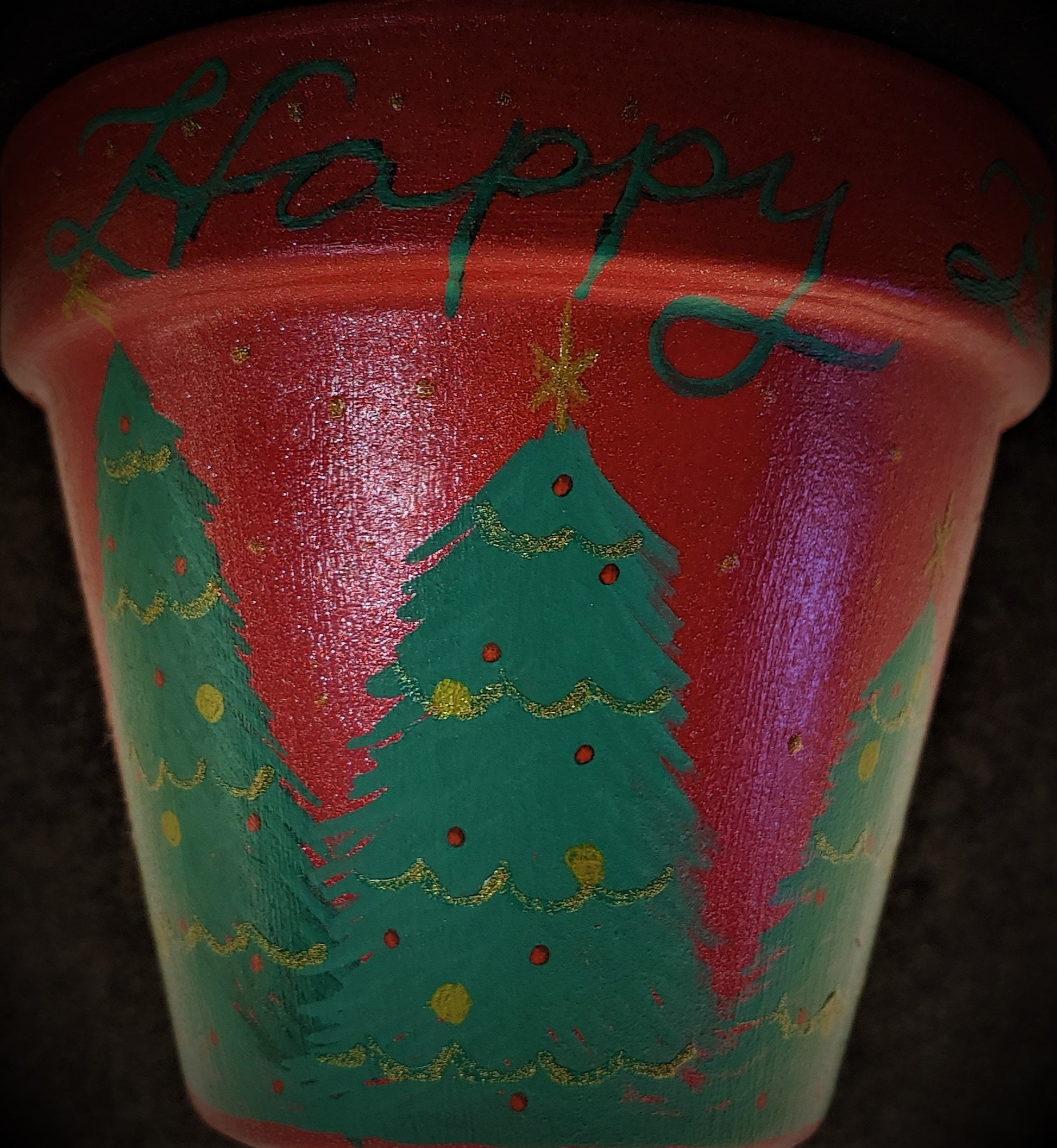 Bright red background with decorated Christmas trees, finished off with "Happy Holidays"!