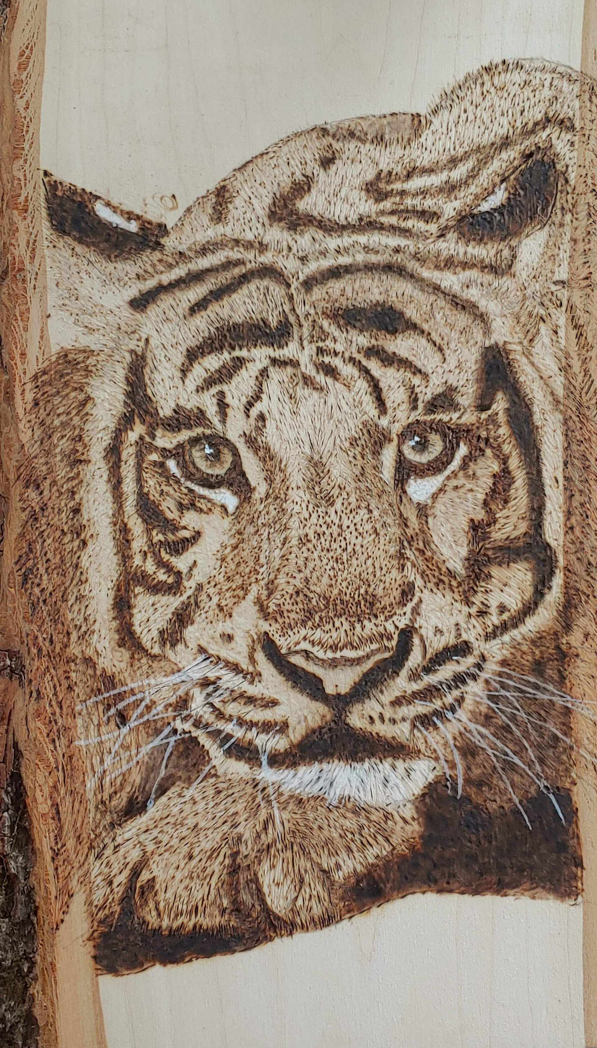 Tiger staring right back atcha! Burned on live-edge birch, approximately 9"x12".